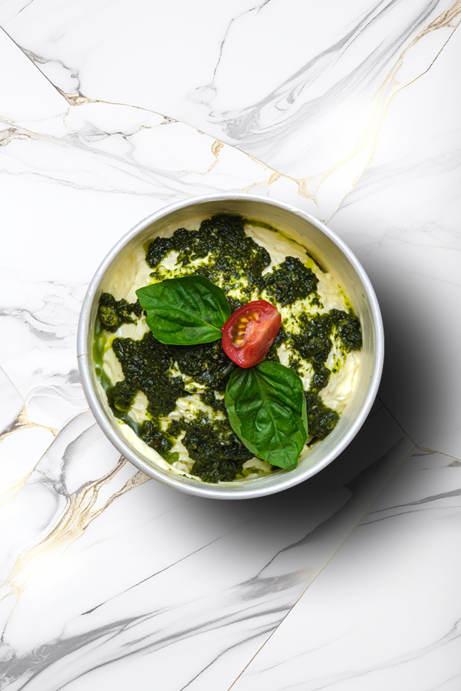 Un pesto aux amandes préparé avec soin, qui apporte une touche de douceur et de caractère à la stracciatella, pour une expérience gourmande unique.